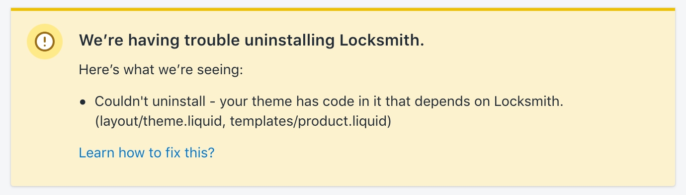 Because of this, Locksmith will NOT run an uninstallation if it detects custom manual locking code in your theme. If this is affecting you, you'll see this warning in the app, letting you know exactly which theme files contain the detected code: