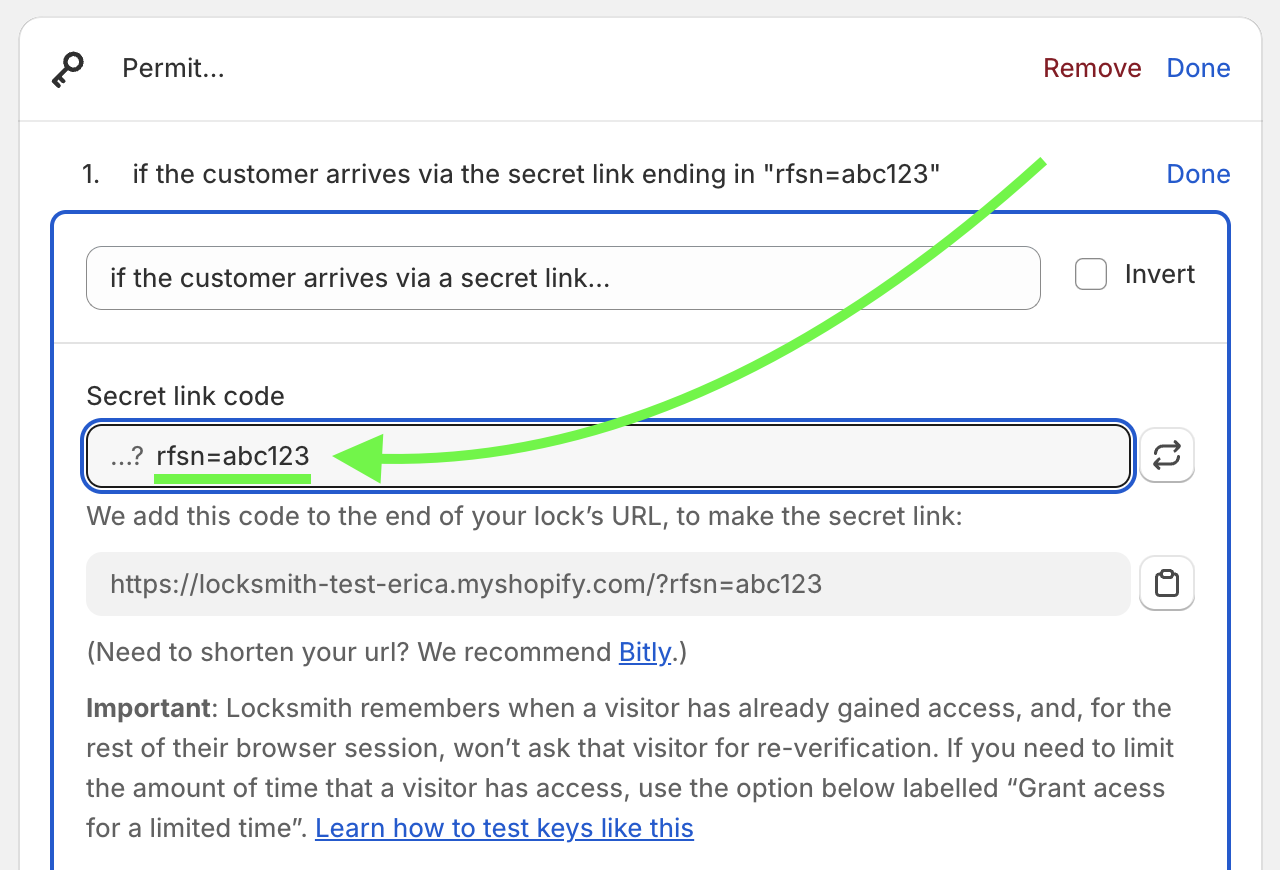 For example, if you're using a referral URL that looks like <https://example.com/?rfsn=abc123>, you may set your secret link code to "rfsn=abc123", and your Locksmith key will just work: