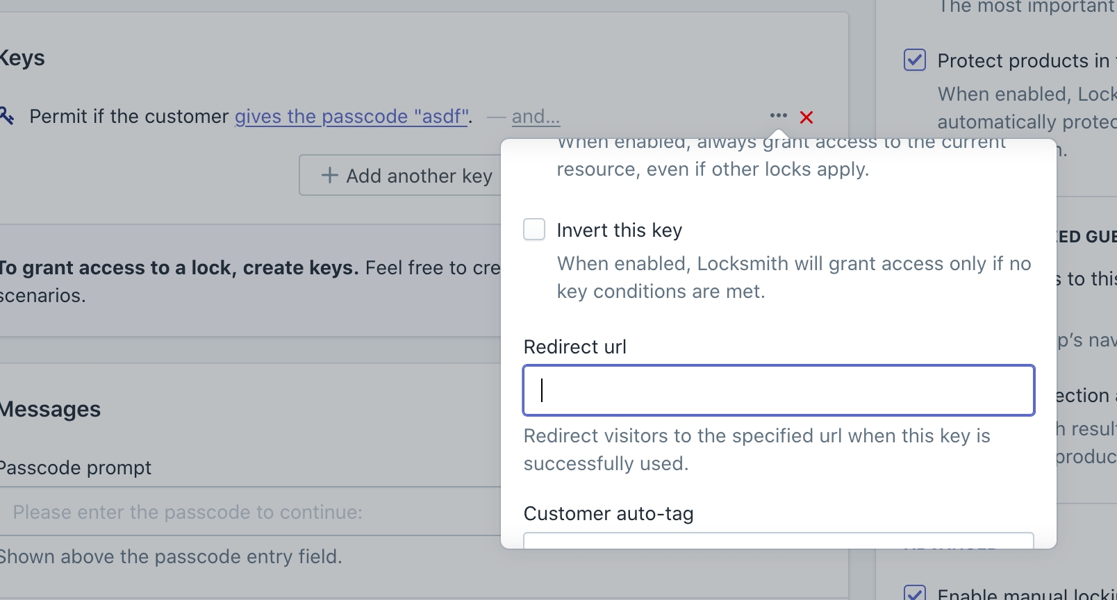 If you like, use the key's advanced settings to add an automatic redirect, routing the customer to the right product page when they enter the right passcode. You can find this setting by clicking the triple-dot icon, to the right of the key condition.