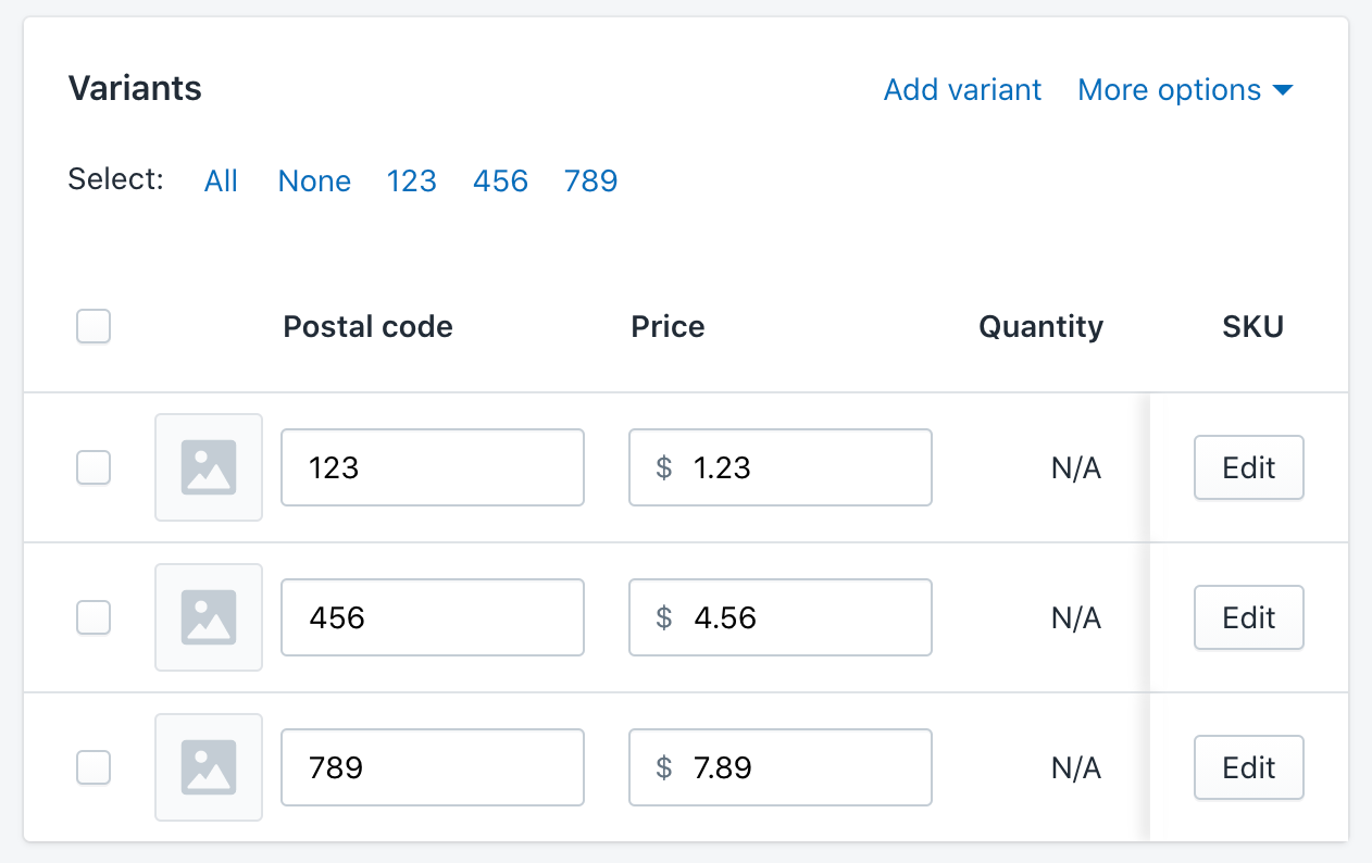 Only display variants that have their "Postal code" option set to equal the postal code that the visitor entered