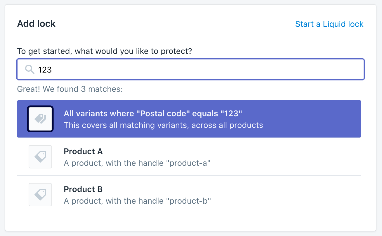 You're done! When visitors arrive at your online store, they'll be prompted to enter their postal code. If it's one of the codes on your list, Locksmith will let them in, and will now only show them variants that match the postal code they entered.