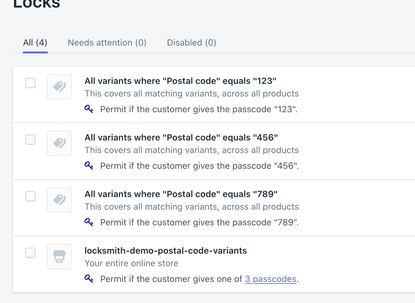 Repeat for each of your postal codes, resulting in one lock per postal code variant option.