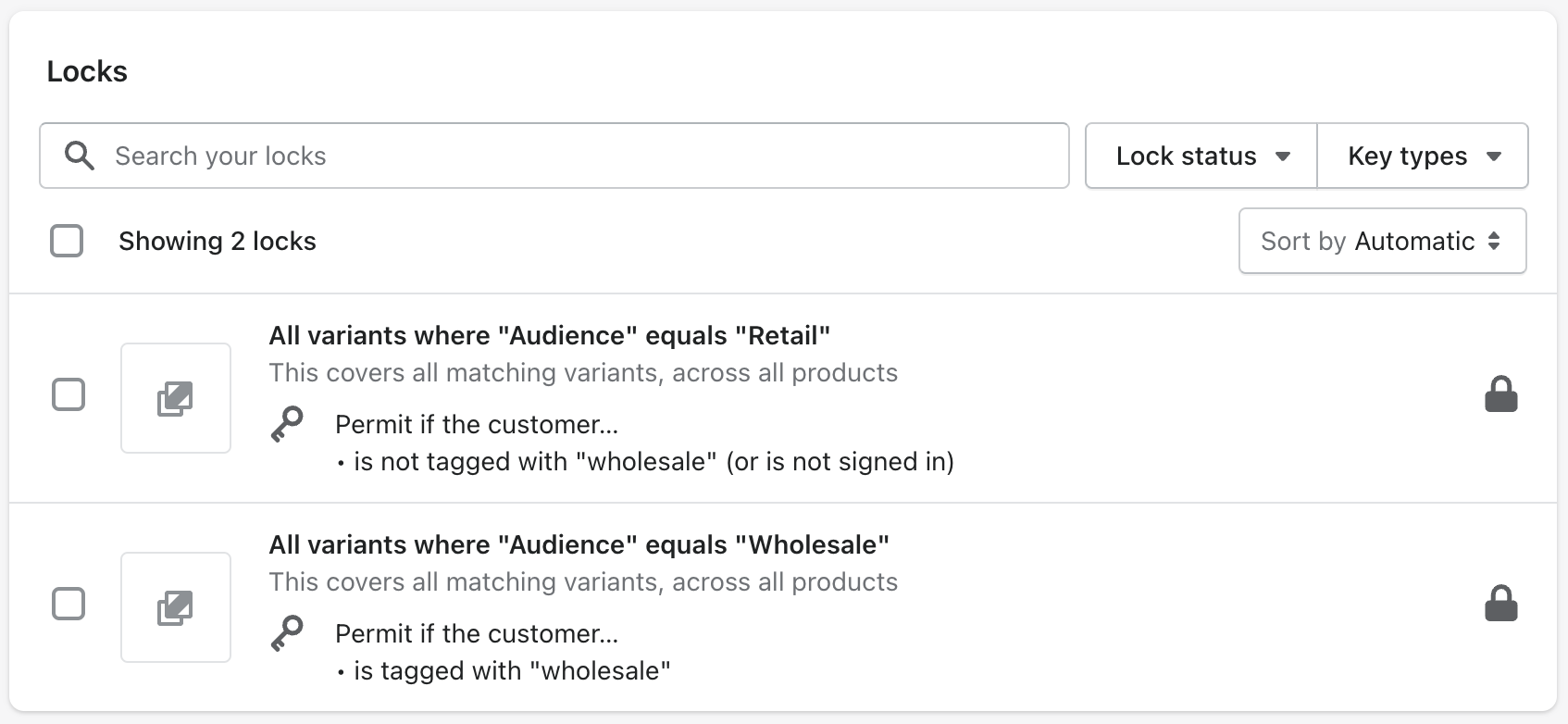 You may want to consider also adding a lock to your retail products, so that wholesale customers don't get confused after they sign in. We'll use a new lock with the opposite condition, to make sure that the customer can only view your retail products if they're not approved.